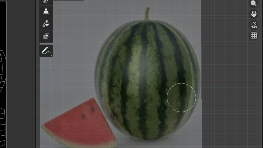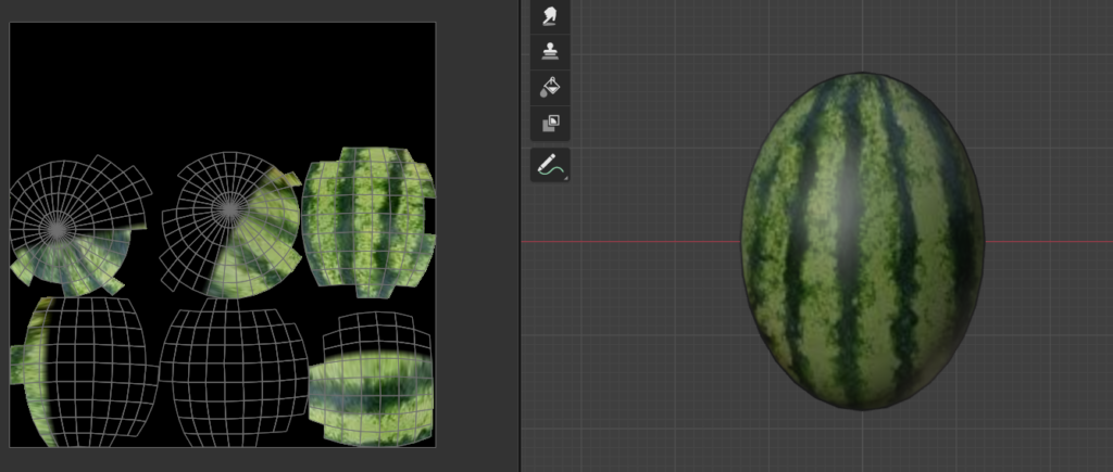 Para las partes inferior y superior de la sandía usaremos la segunda imagen para encontrar dos caras y así pintarlas. Hacemos el mismo procedimiento desde la selección de la imagen como textura.