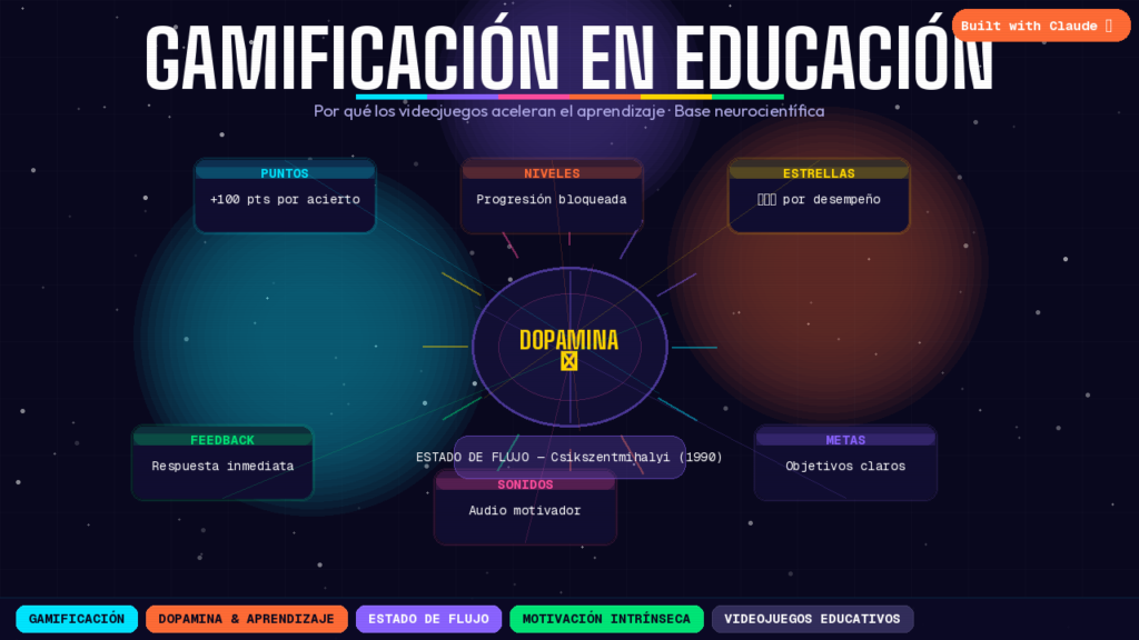 La gamificación aplica mecánicas de videojuegos (puntos, niveles, recompensas, retroalimentación inmediata) en contextos educativos. Su eficacia tiene base neurocientífica: cada respuesta correcta celebrada con animaciones y sonidos libera dopamina, reforzando el circuito de aprendizaje. El psicólogo Mihaly Csikszentmihalyi llamó a este estado flujo: concentración total en la que el tiempo parece detenerse y el aprendizaje ocurre de forma casi involuntaria.