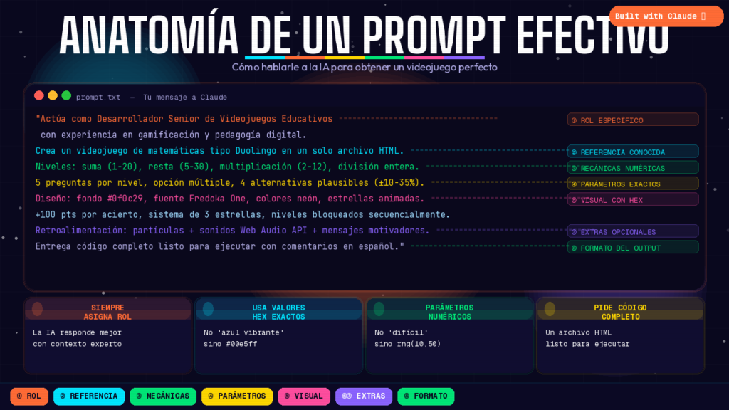 Este es el paso central. Un prompt efectivo tiene cuatro partes: rol asignado a la IA, descripción visual detallada, mecánicas de juego con parámetros exactos y especificación técnica del entregable. El siguiente prompt fue el que generó MathQuest: