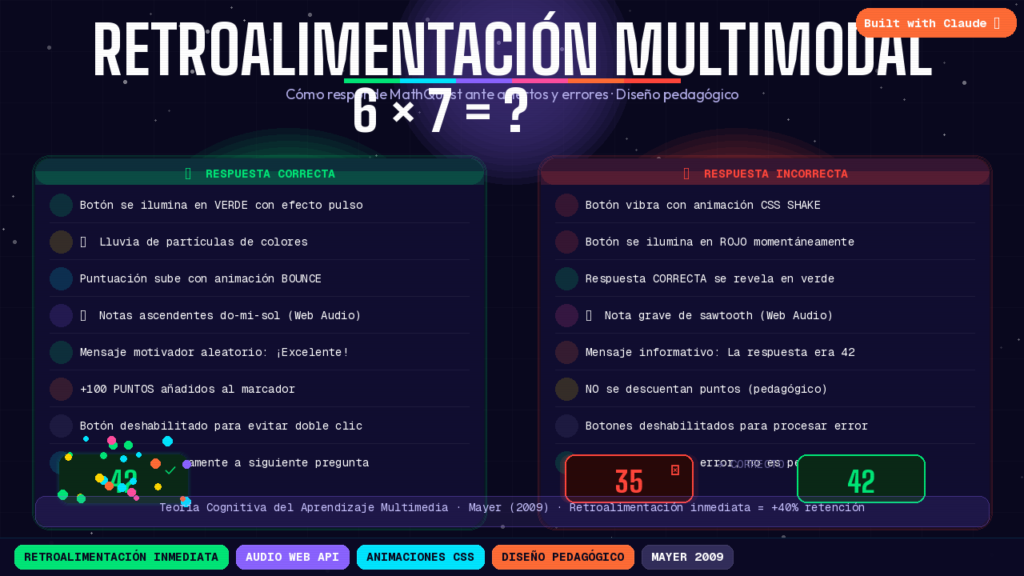 La retroalimentación inmediata es el factor más determinante en la velocidad de aprendizaje. En MathQuest, una respuesta correcta activa simultáneamente: botón con animación de pulso verde, lluvia de partículas coloridas, puntuación con efecto bounce y tres notas ascendentes (do-mi-sol) generadas con Web Audio API sin archivos externos. La respuesta incorrecta muestra la correcta en verde, vibra el botón elegido y emite una nota grave. Este diseño multimodal refuerza el aprendizaje tanto en aciertos como en errores, convirtiendo cada fallo en información útil y no en penalización desmoralizadora.