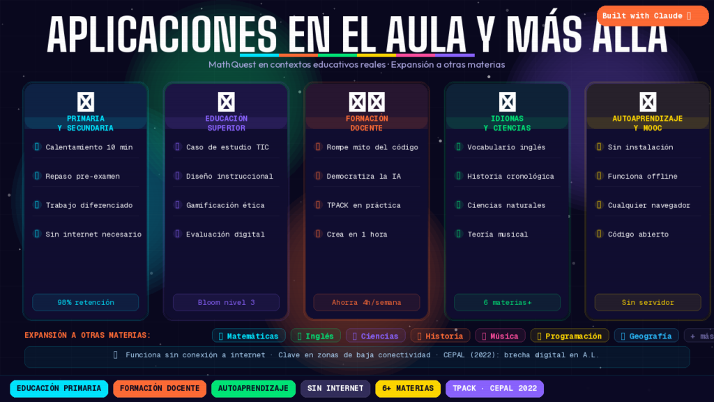 En el aula, MathQuest puede usarse como actividad de calentamiento de 10 minutos al inicio de la clase, herramienta de repaso previo a evaluaciones, recurso de trabajo diferenciado (los estudiantes avanzados avanzan a niveles superiores mientras el docente atiende a quienes necesitan refuerzo) o como premio al finalizar las actividades regulares. Al ser un único archivo HTML que funciona sin internet una vez cargada la fuente tipográfica, es especialmente útil en contextos con conectividad limitada.