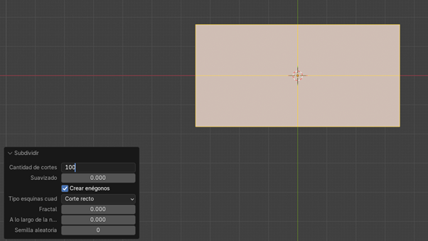 Posteriormente, subdividimos el plano en aproximadamente 100 divisiones para contar con mayor cantidad de vértices y lograr más detalle.