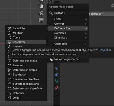 Nos dirigimos a la sección de Modificadores y seleccionamos la opción Desplazamiento (Displace).