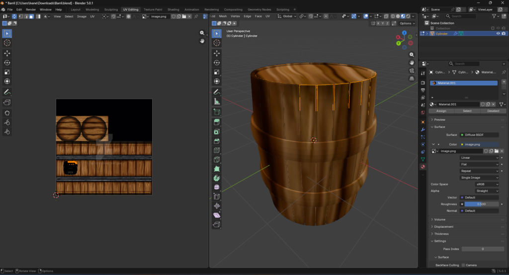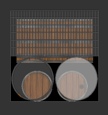 En tus capturas de pantalla, vemos una textura que incluye tablones verticales y aros metálicos. El truco aquí es seleccionar las caras de las UVs y alinearlas exactamente sobre los tablones de la imagen. Si los tablones en el visor 3D se ven horizontales cuando deberían ser verticales, simplemente rota las islas UV 90 grados en el editor.