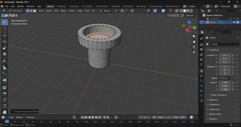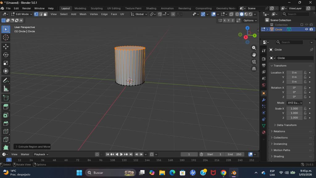 Una vez establecido el círculo base, entramos en Edit Mode (Tab). El proceso sigue esta lógica: