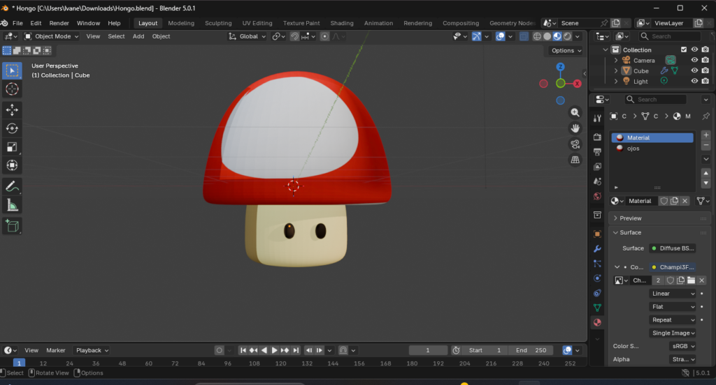 El desafío del champiñón es que su textura tiene elementos muy específicos: los círculos blancos sobre el fondo rojo. Si el mapa UV está mal desplegado, los círculos se verán como óvalos estirados.