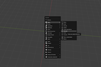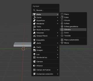 Insertamos un cilindro desde Shift + A → Malla → Cilindro.