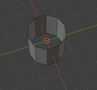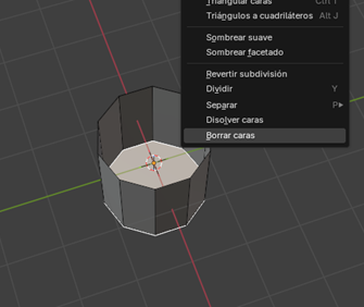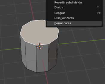 Seleccionamos la cara superior y la eliminamos con X → Faces. Repetimos el mismo procedimiento con la cara inferior para dejar la figura hueca.