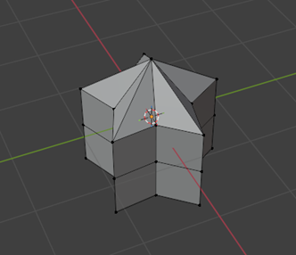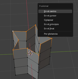 Seleccionamos todos los vértices superiores. Presionamos M → ‘En el Centro’ para fusionarlos en el centro. Este paso genera el efecto de puntas que convergen hacia un punto.