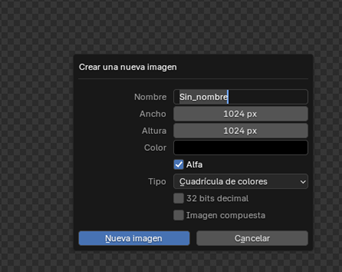 Nos dirigimos al Editor UV. Creamos una nueva imagen seleccionando “Cuadrícula de Colores”, esto nos permite visualizar cómo se distribuye la textura sobre la superficie.