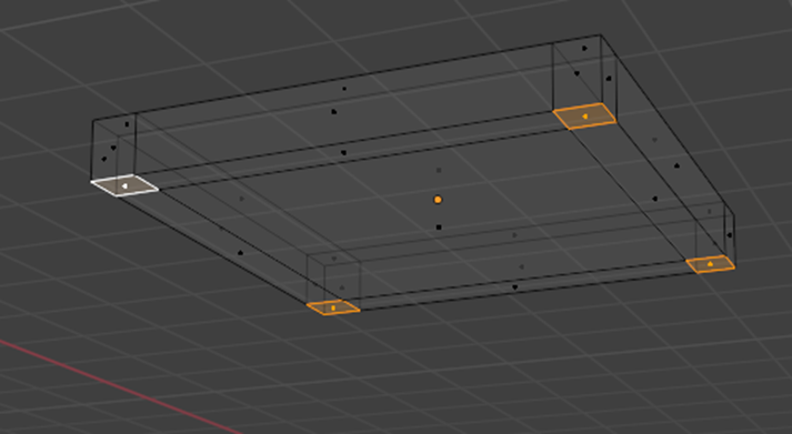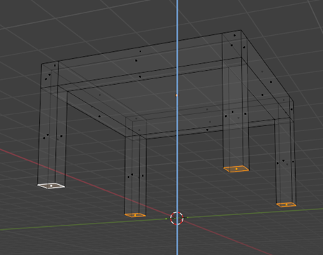 Seleccionamos las caras inferiores que quedaron delimitadas por los cortes realizados presionamos E para extruir y luego Z para extruir hacia abajo en el eje vertical y ajustamos la altura según la proporción deseada. De esta manera se forman las cuatro patas de la mesa.