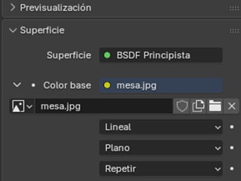 Vamos al panel de Materiales. Creamos un nuevo material. En “Color Base” seleccionamos “Imagen”. Cargamos la imagen correspondiente. Comprobamos en modo Vista Material que la textura se aplique correctamente.