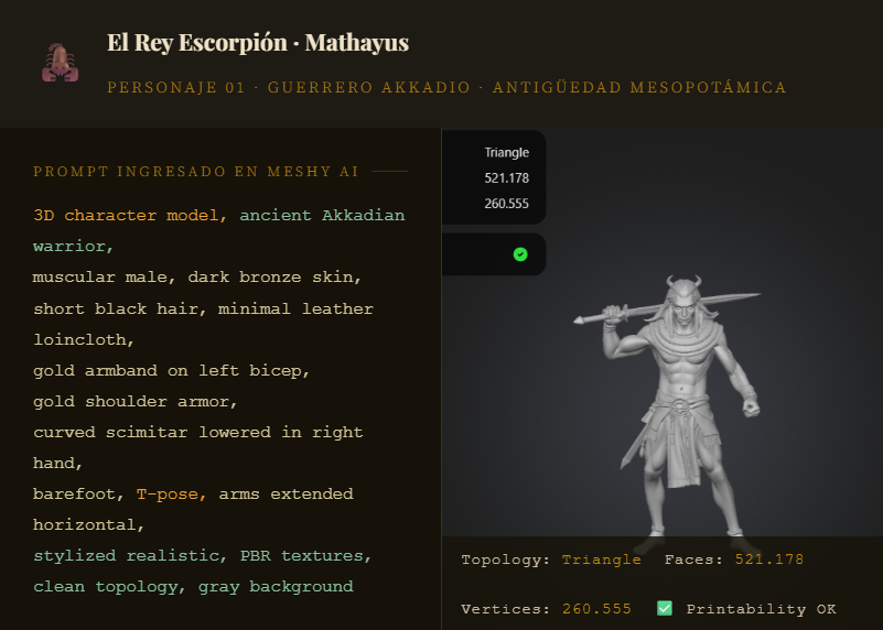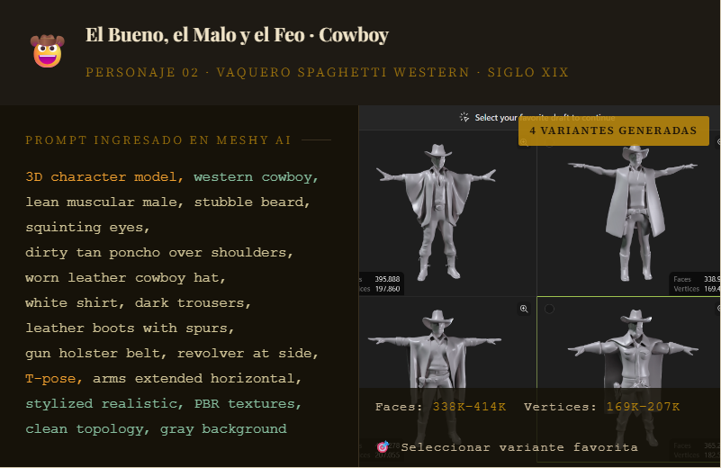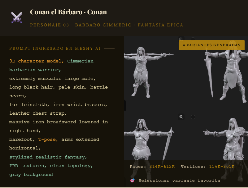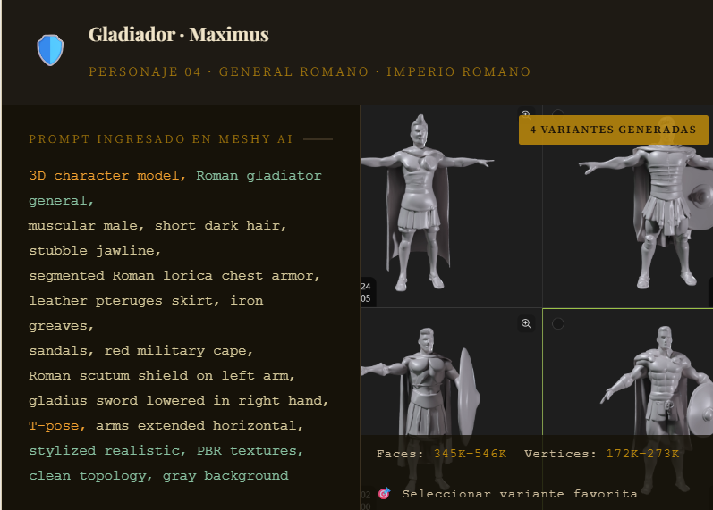 Todos los ejemplos siguen la misma secuencia: tipo de modelo → rasgos físicos → vestimenta → accesorios → pose T → parámetros técnicos. Además, Meshy AI genera 4 variantes automáticamente. El usuario elige la mejor. Más opciones, mismo tiempo de trabajo.
