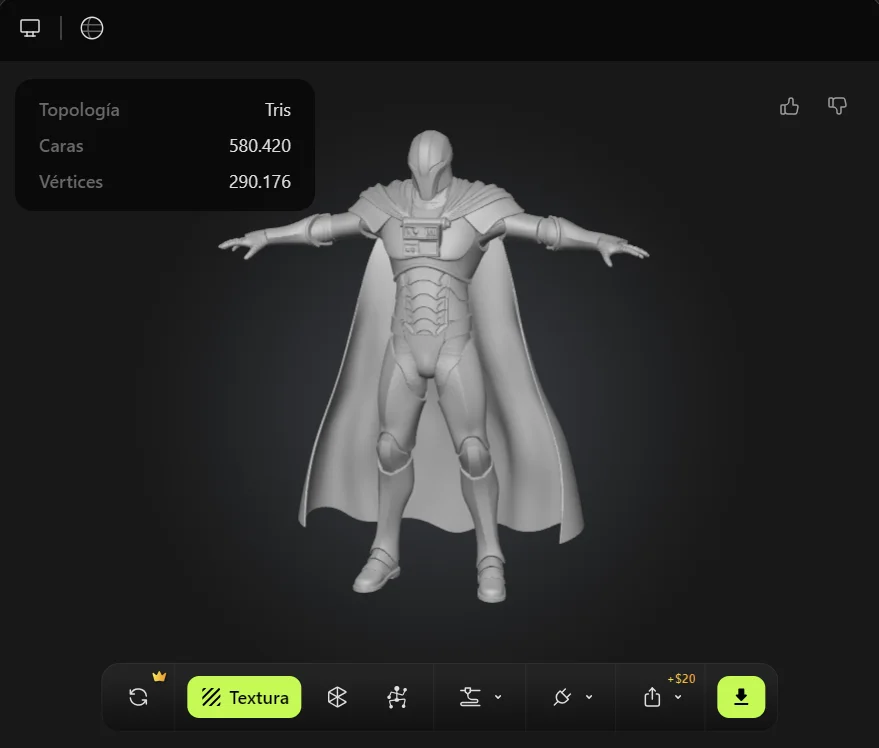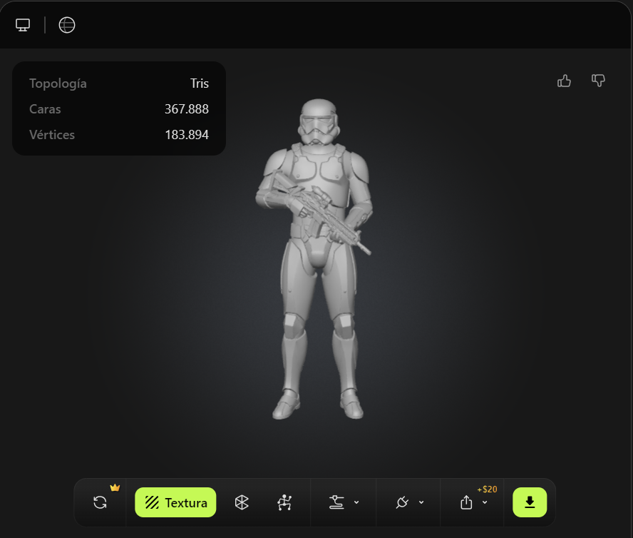 El Stormtrooper es quizás el personaje más adecuado para demostrar las capacidades de Meshy AI en modelado de armaduras hard surface. Su diseño completamente blanco, con juntas negras y geometría segmentada, permite evaluar la precisión en bordes, la diferenciación de materiales y la consistencia simétrica del modelo final.