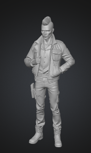 modelo 3D de cuerpo completo, hombre con corte mohicano, chaqueta militar, strict T-pose bind pose, brazos rectos horizontales, postura rígida simétrica, piel con imperfecciones, texturas PBR 4K, iluminación de estudio, fondo neutro