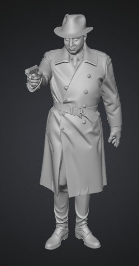 modelo 3D de cuerpo completo, caballero años 40 con gabardina y sombrero, strict T-pose bind pose, brazos extendidos 90 grados, simetría perfecta, escala de grises, texturas PBR, iluminación suave HDRI, fondo neutro
