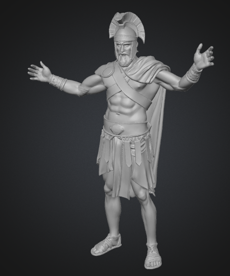 modelo 3D de cuerpo completo, gladiador romano con armadura, cuerpo musculoso, strict T-pose bind pose, brazos extendidos horizontales, manos abiertas, simetría completa, texturas PBR 4K metal y piel, iluminación HDRI, fondo gris