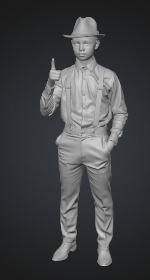 modelo 3D de cuerpo completo, joven con sombrero bombín, ropa blanca con tirantes, strict T-pose bind pose, brazos extendidos 90 grados, postura rígida, simetría total, piel detallada, texturas PBR 4K, iluminación neutra