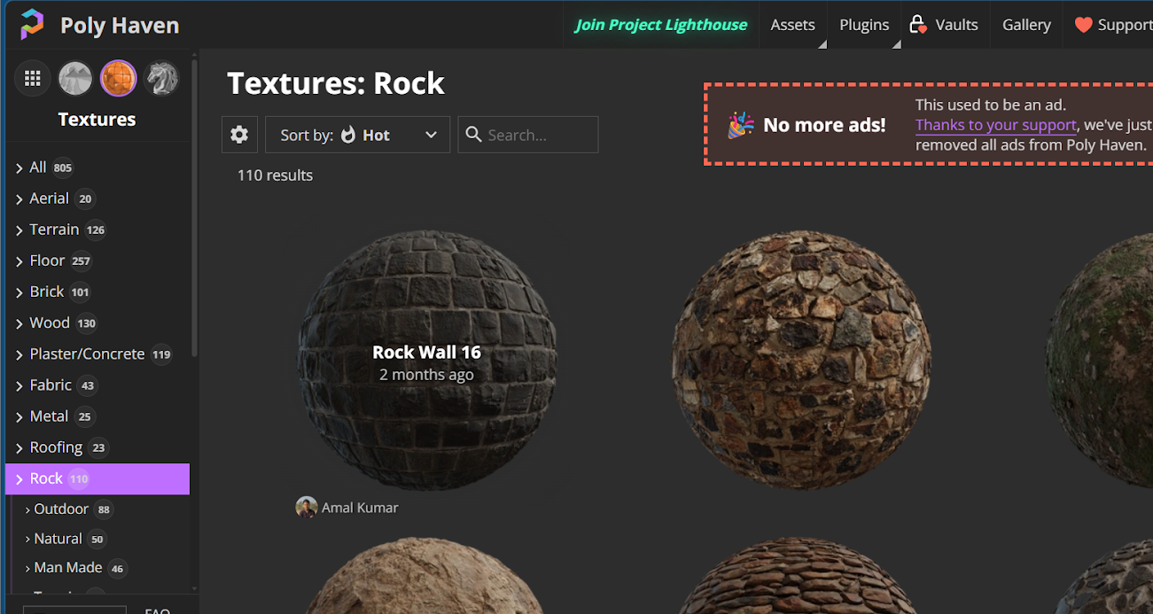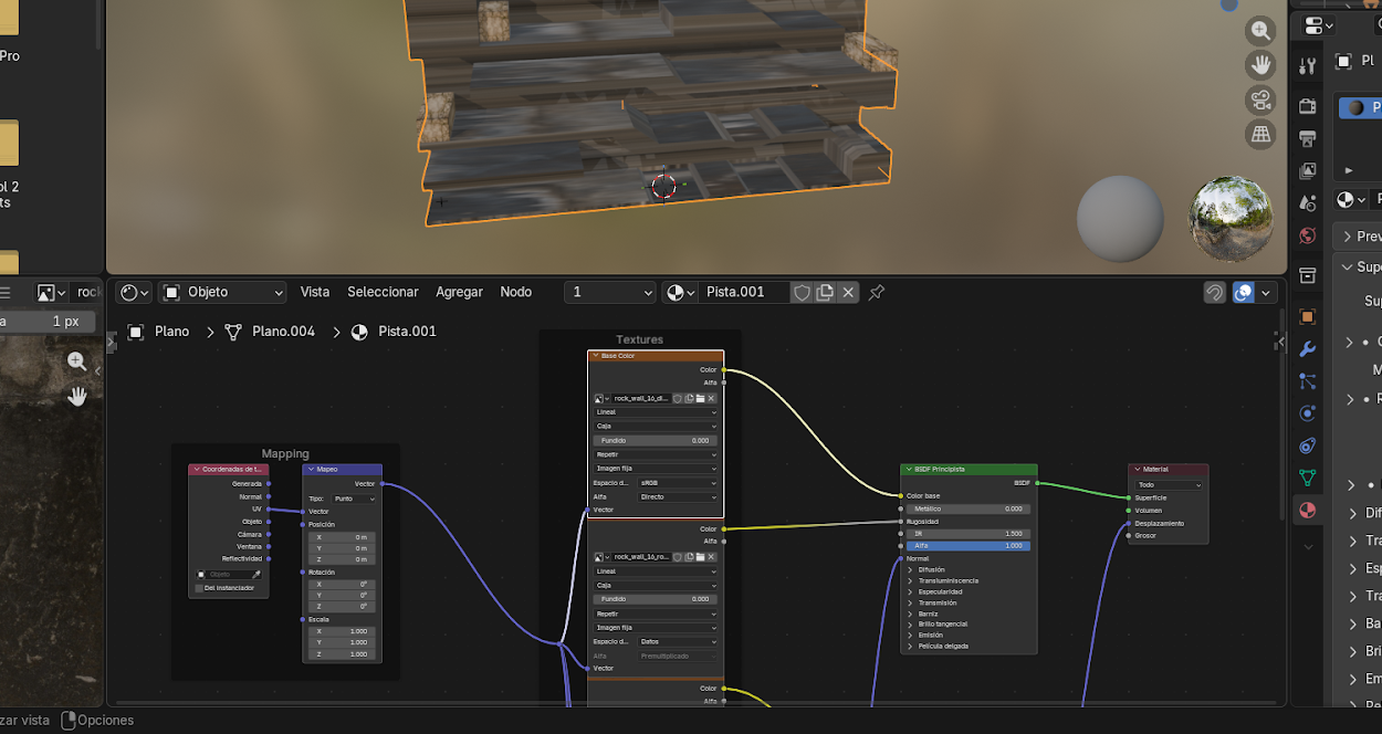 Para la pista, se utiliza una textura de roca de alta calidad obtenida de Polyhaven, la cual incluye múltiples mapas que permiten simular propiedades físicas del material.