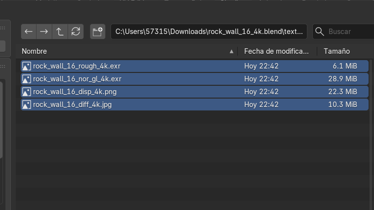 Tras la descarga, se descomprimió el paquete de texturas para extraer los mapas esenciales que definen la superficie: