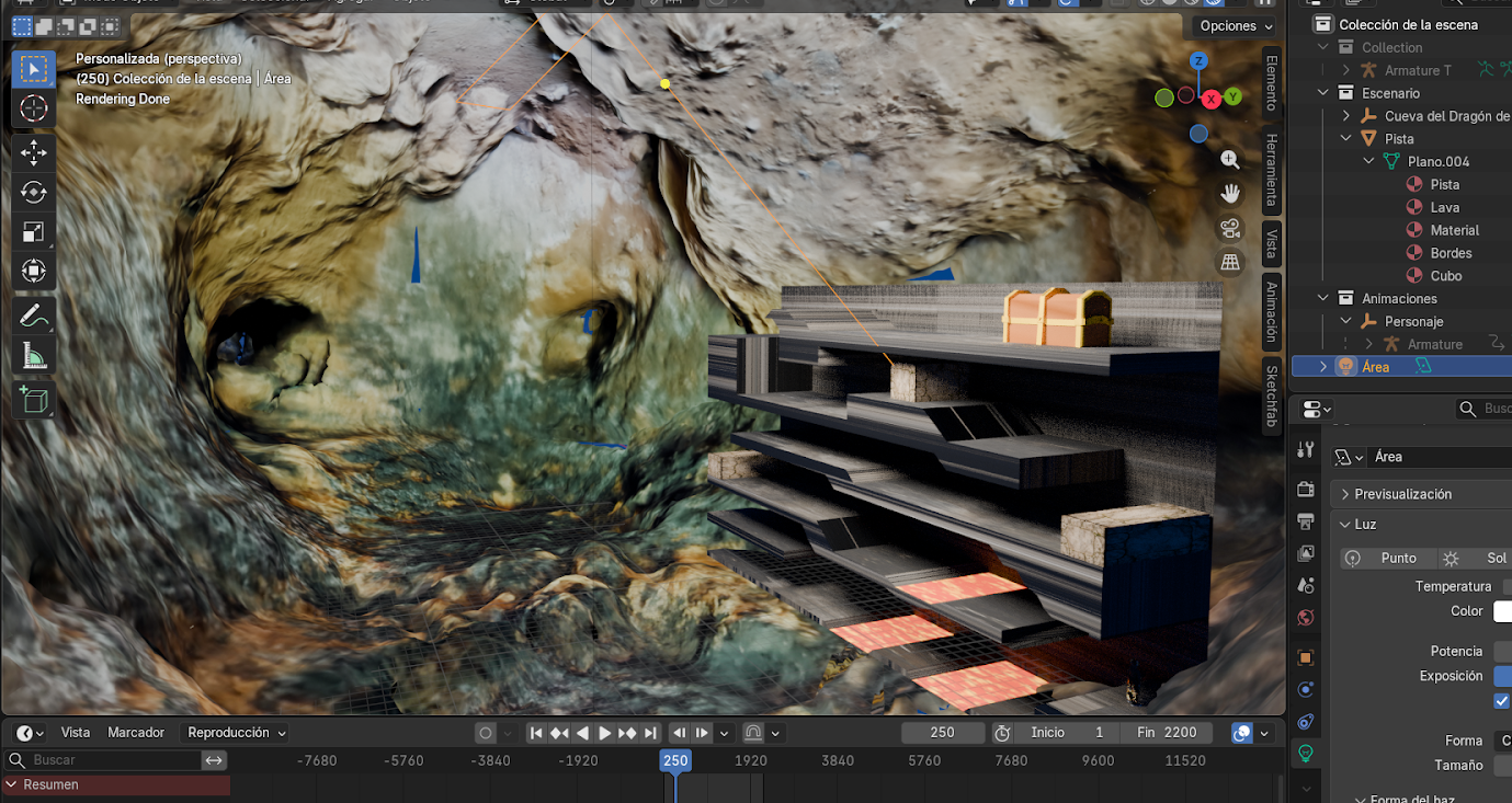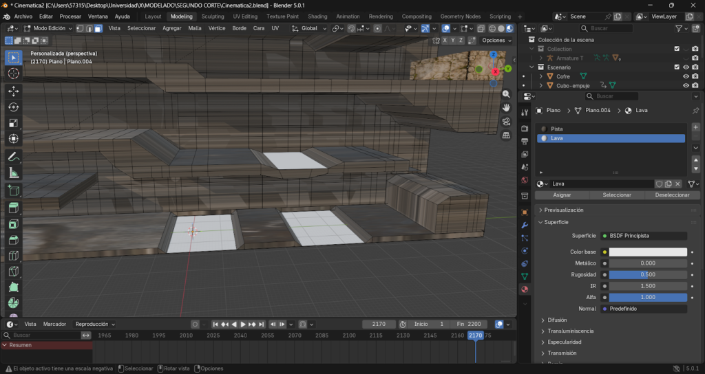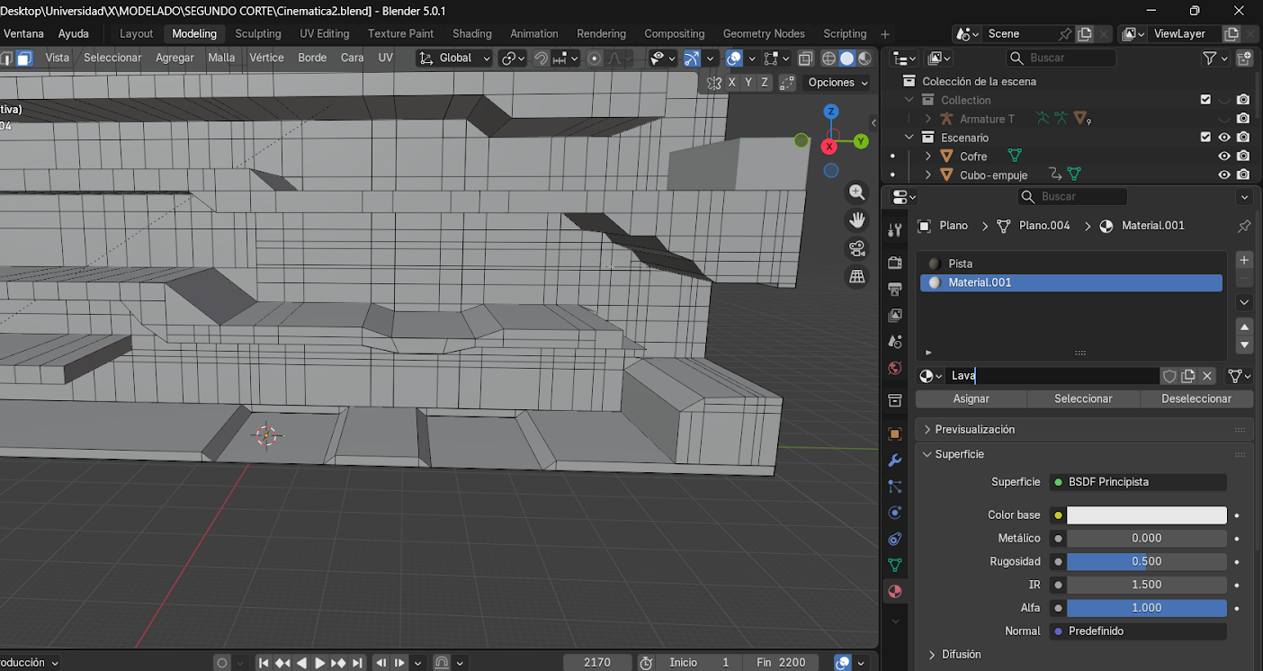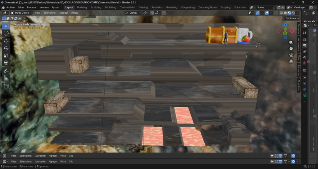 El desarrollo de una cinemática en Blender requiere la integración de diferentes procesos como modelado, texturizado, animación e iluminación. En este proyecto se construye una pista de obstáculos inspirada en juegos tipo Fire and Water, donde se simula un recorrido con múltiples niveles, plataformas y zonas de peligro como lava.