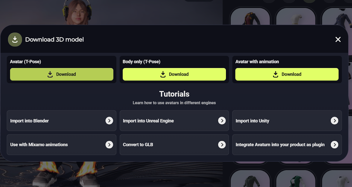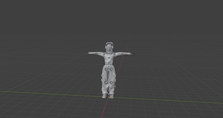 El personaje se importa desde Avaturn en pose T, lo que permite acceder correctamente a sus materiales originales (ropa y accesorios).