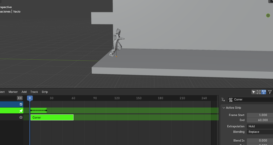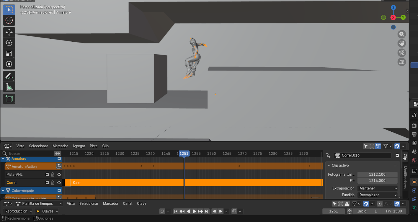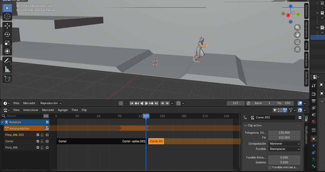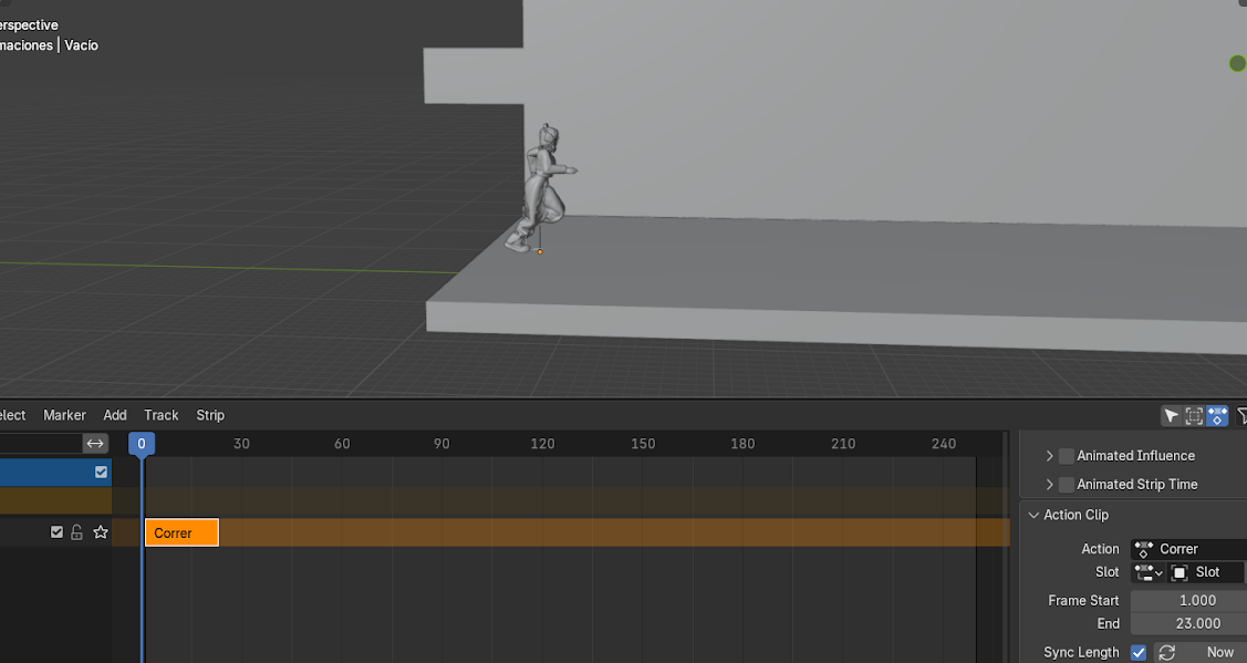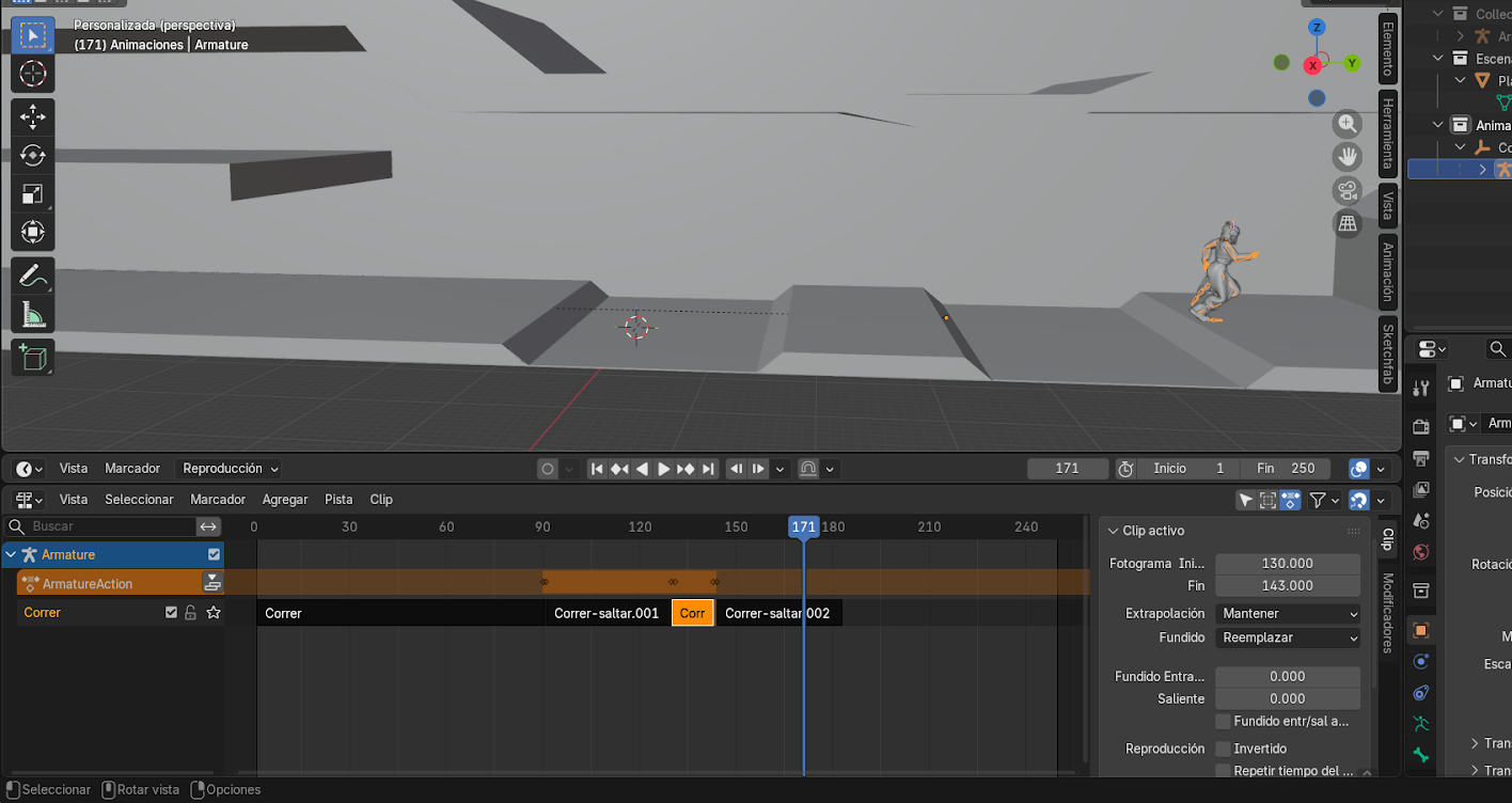 - Mover el personaje con G hasta que coincida con la posición final de la animación anterior.