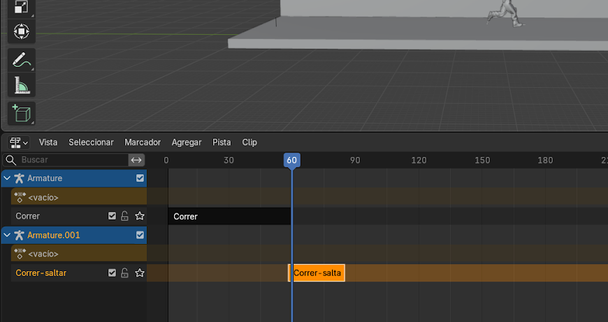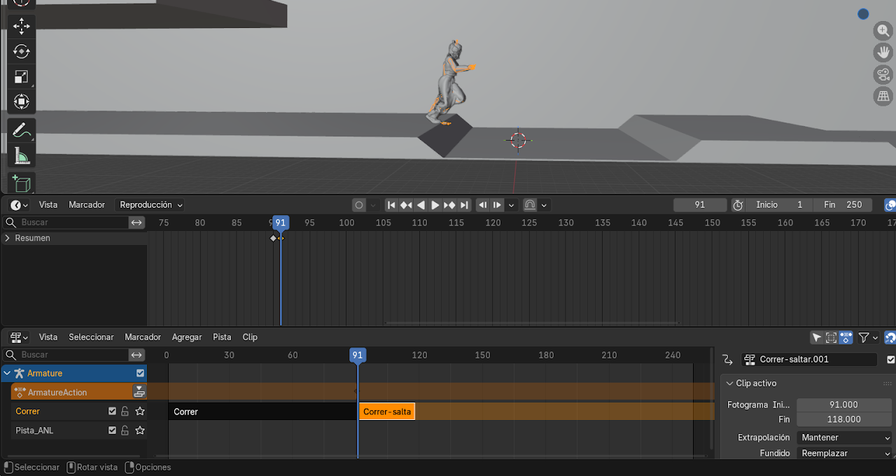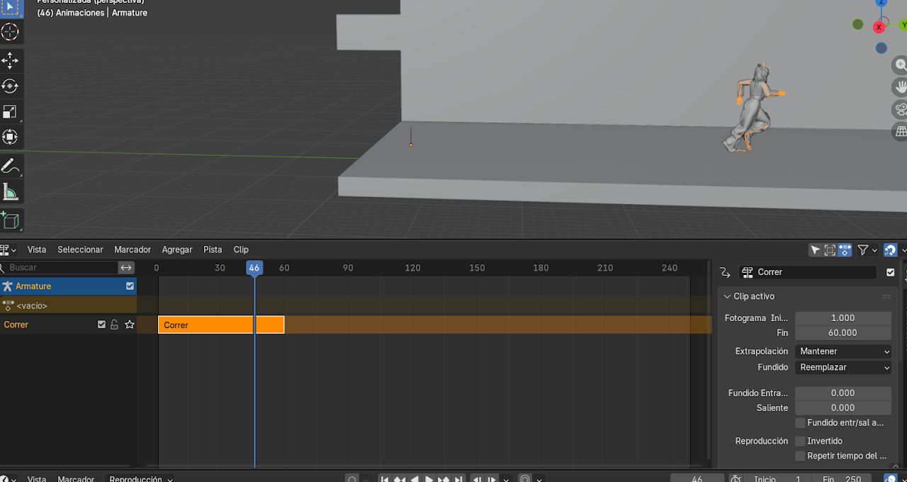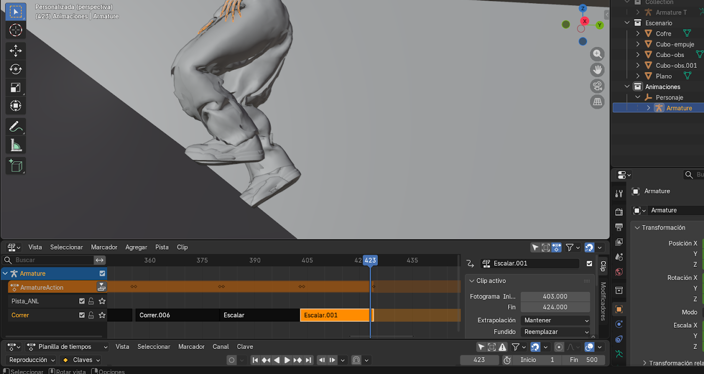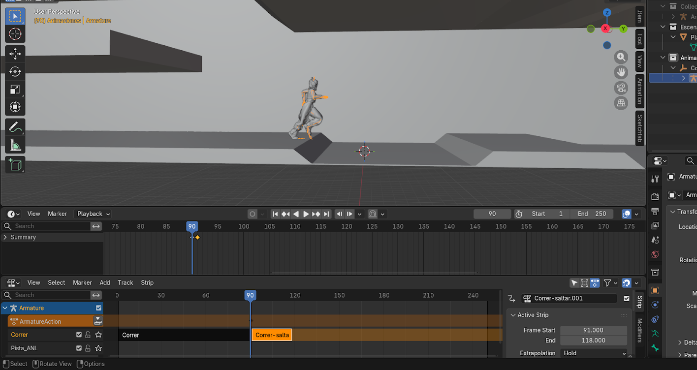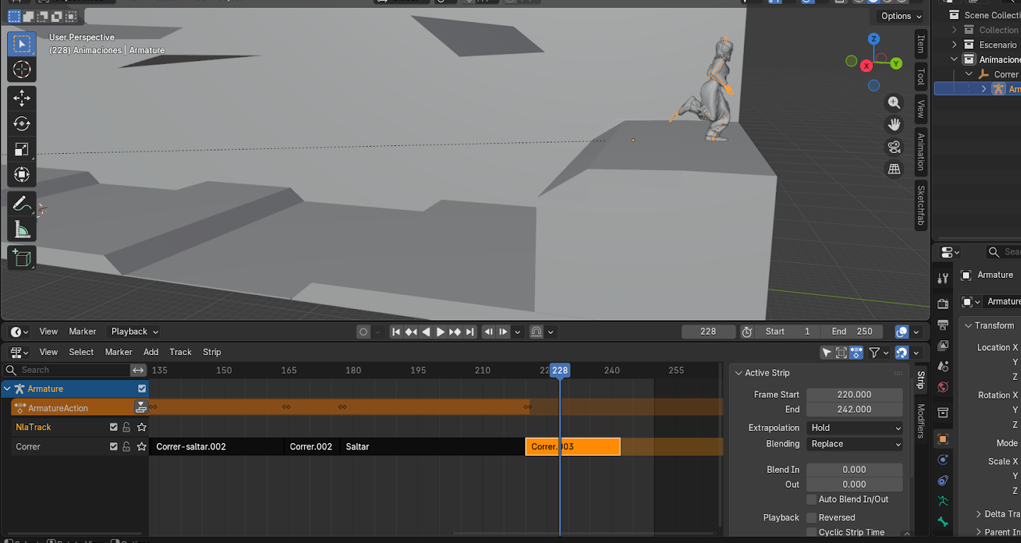 - Mover el personaje con G hasta que coincida con la posición final de la animación anterior.