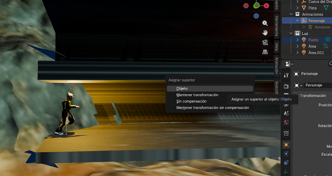 - Seleccionar la luz tipo Punto en el panel de la derecha (Outliner), moverla encima del personaje según se desee, luego presionar Ctrl + P y seleccionar “Objeto” para vincularla.