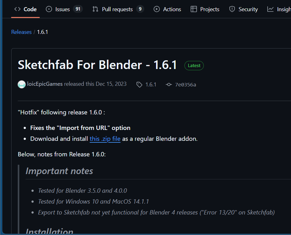 Plugin de Importación: Complemento oficial sketchfab/blender-plugin descargado desde GitHub.