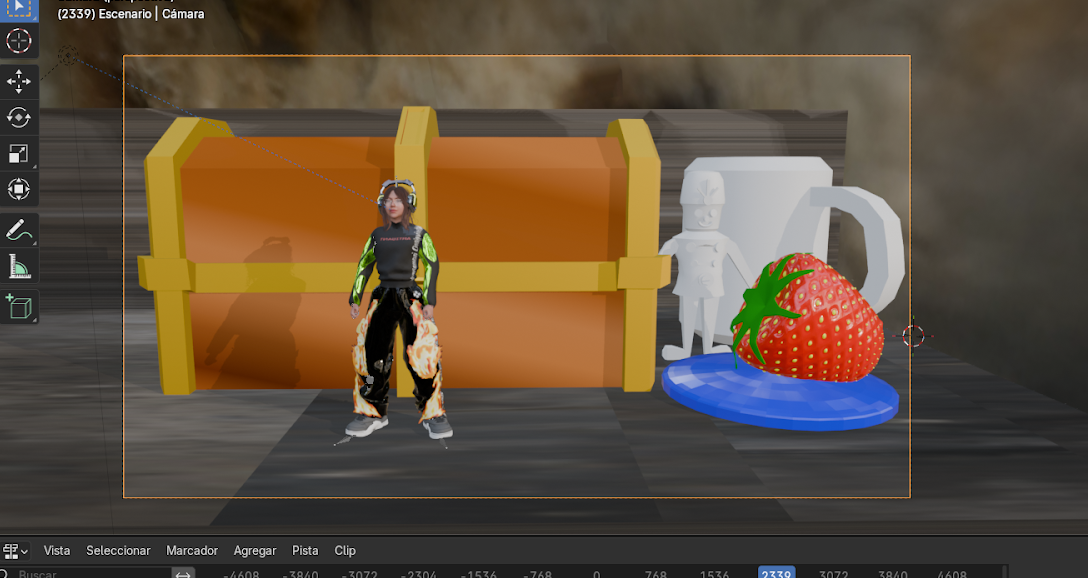 Además de la construcción del entorno, se incorporan personajes animados que interactúan con el escenario, permitiendo generar una experiencia visual dinámica y coherente.