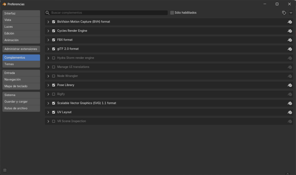 - Ir a Editar → Preferencias → Complementos.