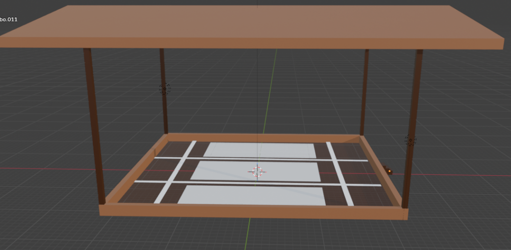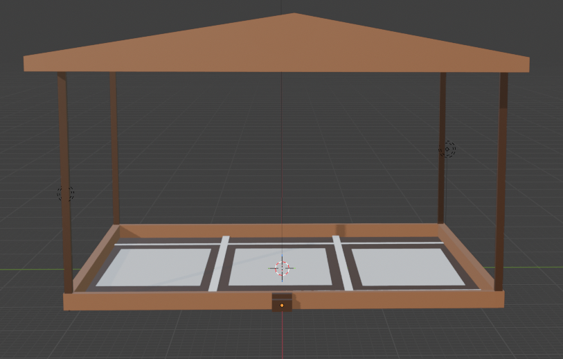 Como punto de partida de nuestra cinemática, construimos manualmente el escenario principal: un dojo japonés modelado desde cero en Blender. En la imagen podemos apreciar la estructura inicial del escenario, compuesta por elementos básicos pero fundamentales para establecer el ambiente de la escena.