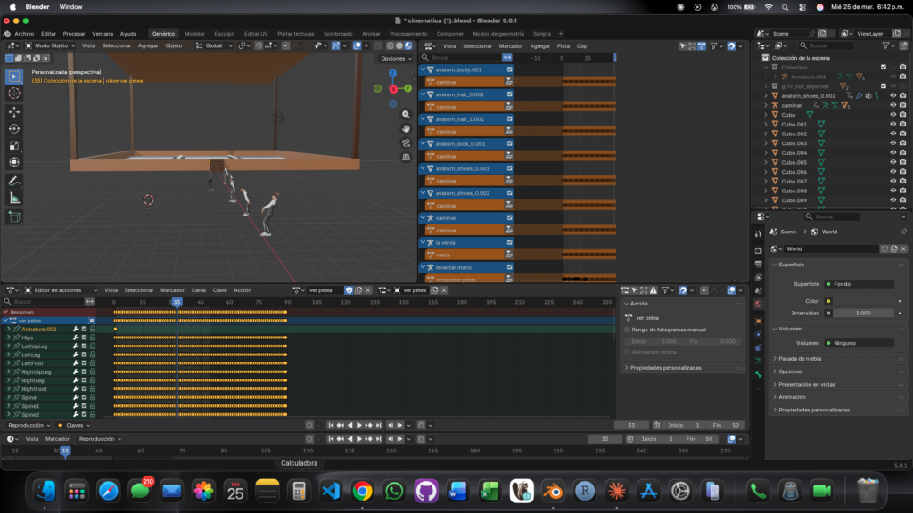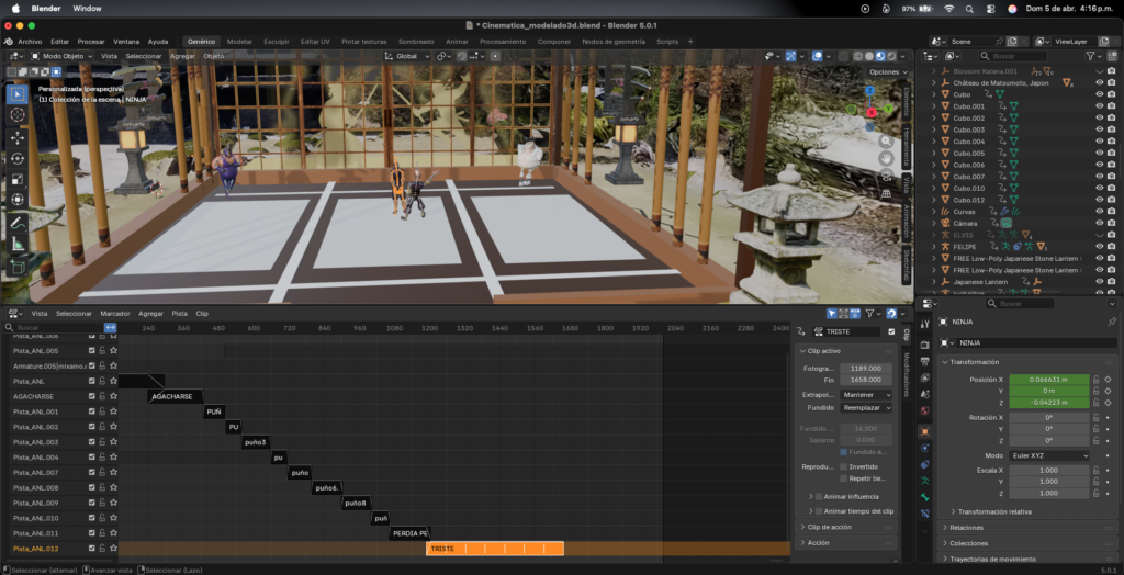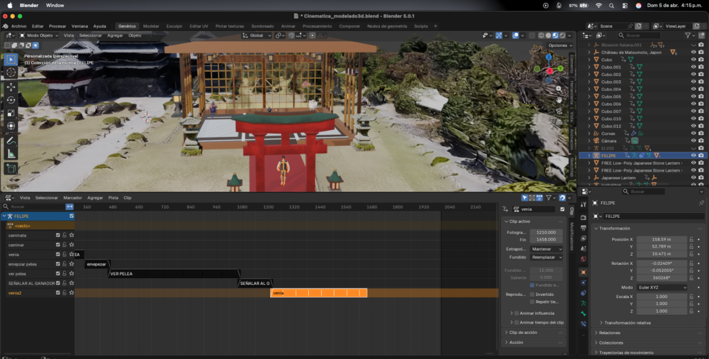 A partir de este punto comenzamos el proceso de animación dentro de Blender, utilizando el Editor de animación no lineal (NLA Editor) para ordenar y secuenciar las cinco animaciones descargadas desde Mixamo, logrando que el personaje camine, levante la mano para iniciar el combate, observe la pelea, señale al ganador y finalice con una reverencia.