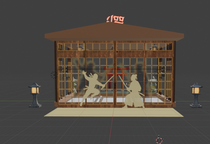 Para enriquecer visualmente el escenario comenzamos a incorporar elementos decorativos descargados gratuitamente desde Sketchfab. Como primer elemento decorativo agregamos un mural representativo de la cultura japonesa, el cual muestra una escena de ninjas en combate. Este detalle no solo aporta autenticidad al ambiente del dojo sino que además refuerza la narrativa de la cinemática, anticipando al espectador el duelo que está por desarrollarse.