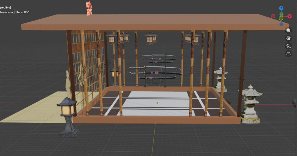 En esta imagen podemos apreciar el avance significativo del escenario tras incorporar múltiples elementos decorativos descargados desde Sketchfab. El dojo cobra una identidad japonesa mucho más auténtica y detallada gracias a los siguientes elementos: