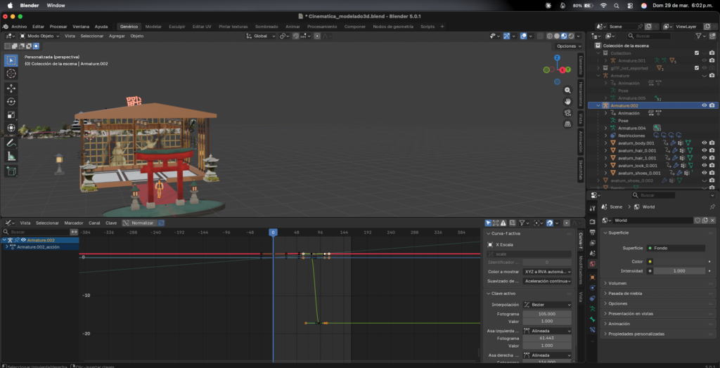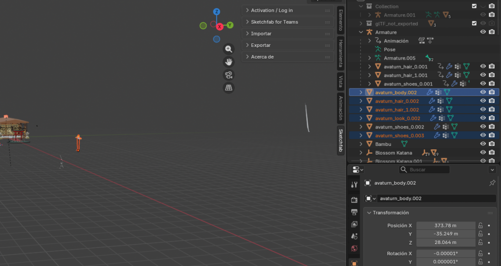 Todos estos assets fueron descargados gratuitamente desde Sketchfab e importados en formato FBX directamente a Blender, donde fueron escalados y posicionados para crear una composición equilibrada y visualmente atractiva. El resultado es un escenario que ya no luce como una estructura básica sino como un dojo japonés auténtico listo para albergar la cinemática.