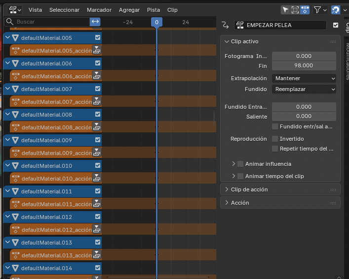 En el panel derecho podemos ver las propiedades del clip activo denominado “EMPEZAR PELEA”, donde se configuran parámetros importantes como el fotograma de inicio y fin, el tipo de extrapolación y el fundido de entrada y salida entre animaciones. Estas configuraciones permiten que las transiciones entre una animación y otra sean suaves y fluidas.