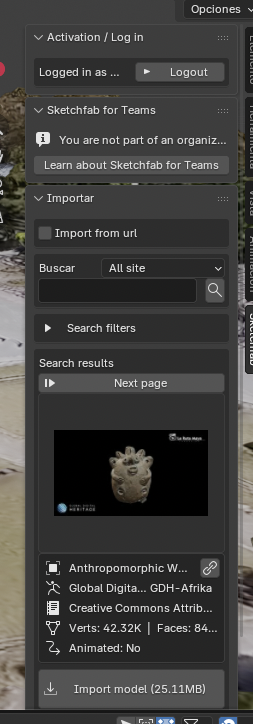 Una vez encontrado el asset deseado hacemos clic en Import model y el modelo se importa directamente a nuestra escena de Blender de forma automática, respetando los derechos de autor y las licencias Creative Commons de cada modelo tal como se indica en la información del resultado.