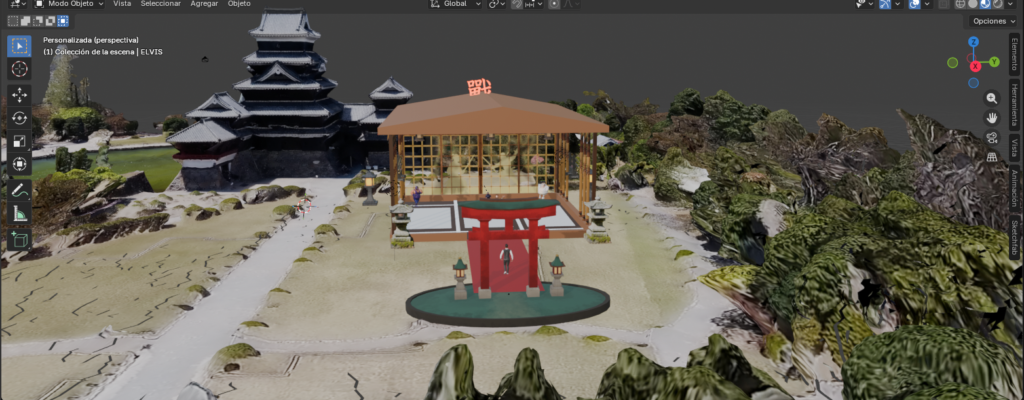 Todos los elementos del entorno — el castillo, la puerta Torii, las rocas, los árboles y las farolas — fueron descargados gratuitamente desde Sketchfab e importados en Blender, donde fueron escalados, posicionados e integrados para crear esta composición final.