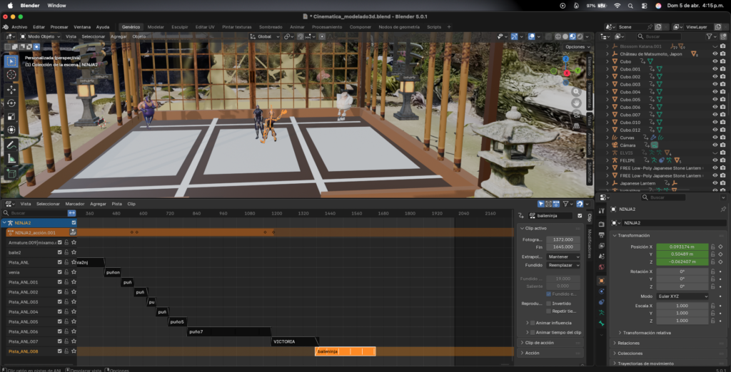 El Ninja 2, como personaje principal ganador de la pelea, presenta una secuencia de animaciones centrada en el combate y la celebración final. En el NLA Editor de Blender, sus acciones están compuestas por múltiples clips de golpes o puños organizados de manera consecutiva, lo que genera una sensación dinámica de pelea. Para mejorar la calidad de la animación, es fundamental aplicar fundidos entre cada clip, evitando transiciones bruscas y logrando movimientos más suaves. Posteriormente, el personaje ejecuta animaciones de victoria y baile, reforzando el resultado del combate. Estas acciones finales pueden extenderse o repetirse para mejorar el impacto visual. También es importante asegurar que todas las animaciones mantengan una posición coherente para evitar desplazamientos inesperados. Con estos ajustes, el Ninja 2 logra una animación fluida, clara y visualmente atractiva.
