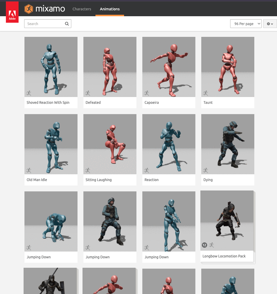 En esta imagen podemos apreciar el catálogo de animaciones disponibles en Mixamo, y como se puede observar la variedad es realmente amplia — existen cientos de animaciones gratuitas listas para aplicar a cualquier personaje.