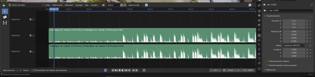 El archivo de audio utilizado es “melodigne-art-martial-170714.mp3” — una melodía de artes marciales que complementa perfectamente la atmósfera del dojo japonés y la intensidad del combate. Como se puede observar la pista aparece duplicada en dos canales — Channel 1 y Channel 2 — lo que permite controlar el volumen y la sincronización del audio de forma independiente a lo largo de los 20 segundos de duración de la cinemática.