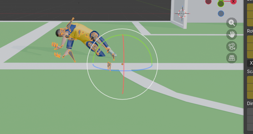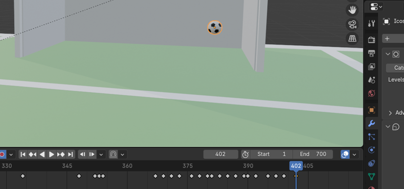 Para la integración del balón en la cinemática 3D en Blender, utilizamos la herramienta de Auto Keying (el botón de grabación en la línea de tiempo). Esta función genera fotogramas clave automáticos cada vez que transformamos un objeto. A lo largo de la escena, desplazamos y rotamos el balón manualmente, asegurándonos de que sus trayectorias (como rodar por el césped o elevarse tras el chute) coincidieran con precisión frame a frame con las animaciones de impacto del pie del jugador.