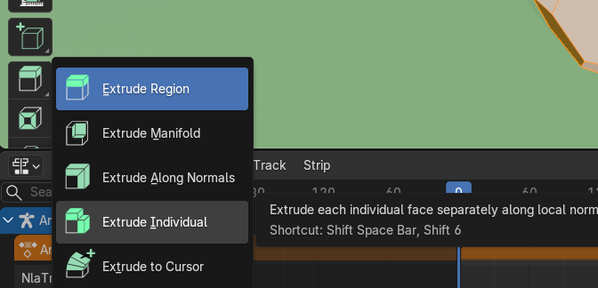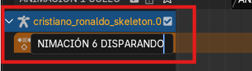 Este botón convierte la acción cruda en un clip tipo strip dentro del Editor NLA, lo que protege la animación original y nos permite editarla. Una vez convertida en clip, podemos agregar el resto de animaciones descargadas presionando Shift + A sobre la pista, lo que desplegará un menú con todas las acciones disponibles en la memoria del archivo.