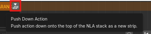 Al importar la primera animación de Mixamo, esta aparece vinculada al personaje con un nombre genérico. Para mantener el orden, renombramos esta acción. Acto seguido, presionamos Push Down Action (Empujar Acción Hacia Abajo).