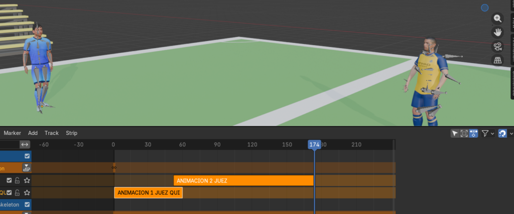 Finalmente, organizamos estas acciones en el Editor NLA, sincronizándolas con los movimientos de Cristiano Ronaldo. Al igual que con el jugador principal, utilizamos keyframes de posición (I) para que el árbitro aparezca en el lugar exacto en el momento del impacto.