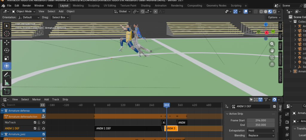 Se importaron las acciones al Action Editor y se convirtieron en Strips con Push Down Action. La dirección se centró en sincronizar el NLA del defensor con el movimiento evasivo del jugador principal, ajustando la posición global mediante keyframes para alinear ambos esqueletos.