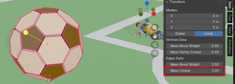 Para darle el volumen y la textura visual de un balón real con costuras, aplicamos una extrusión Individual a todas las caras. Luego, fuimos al panel de transformación y ajustamos el valor de Mean Crease (Pliegue medio) a 1.00, lo que asegura que los bordes mantengan su dureza geométrica en los siguientes pasos.
