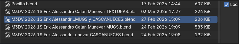 Nos dirigimos a la ruta Archivo > Append y localizamos nuestro archivo .blend original que contenía el Mug y el Cascanueces. Al hacer clic en él, Blender despliega su estructura interna de datos como si fueran carpetas. Ingresamos al directorio Object y, manteniendo presionada la tecla Shift, seleccionamos absolutamente todos los componentes de ambos elementos para traerlos a nuestra escena.